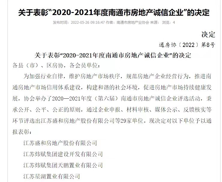近日,南通市房地产业协会公布了关于表彰“2020-2021年度南通市房地产诚信企业”的决定。决定指出,协会秉承公开、公平、公正的原则,通过企业申报、材料审核、媒体公示、反馈核实等环节评选出3044AM永利集团等29家单位,予以通报表彰。