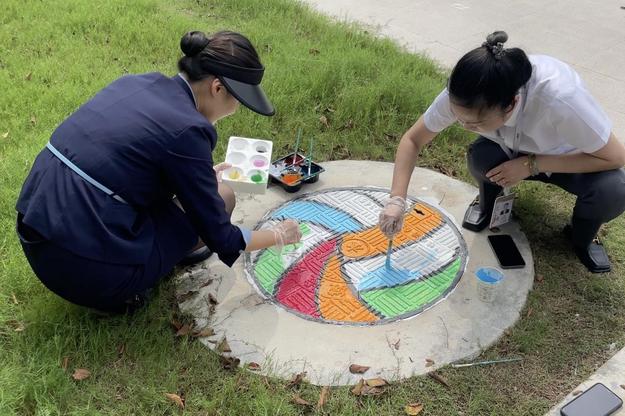 小区主出入口红旗飘飘、配上“欢度佳节”的红灯笼,浓浓的双节氛围在小区里渲染开来。悦家人化身“粉刷匠”妙手“粉刷”,他们扫去浮土、除去锈迹、勾勒轮廓、涂料应用于轮廓之中,在业主们归家的道路上、窨井盖、沿途石球及配电箱刷上各种美好的色彩,一幅幅生动有趣的画面跃然而现,配合上节日氛围布置,给业主们焕然一新的视觉冲击。